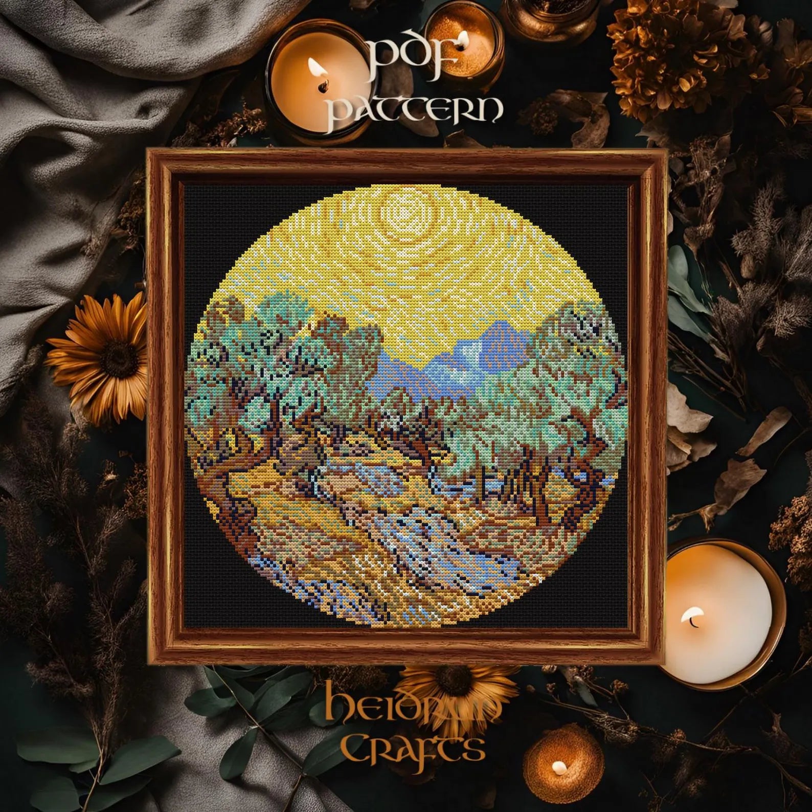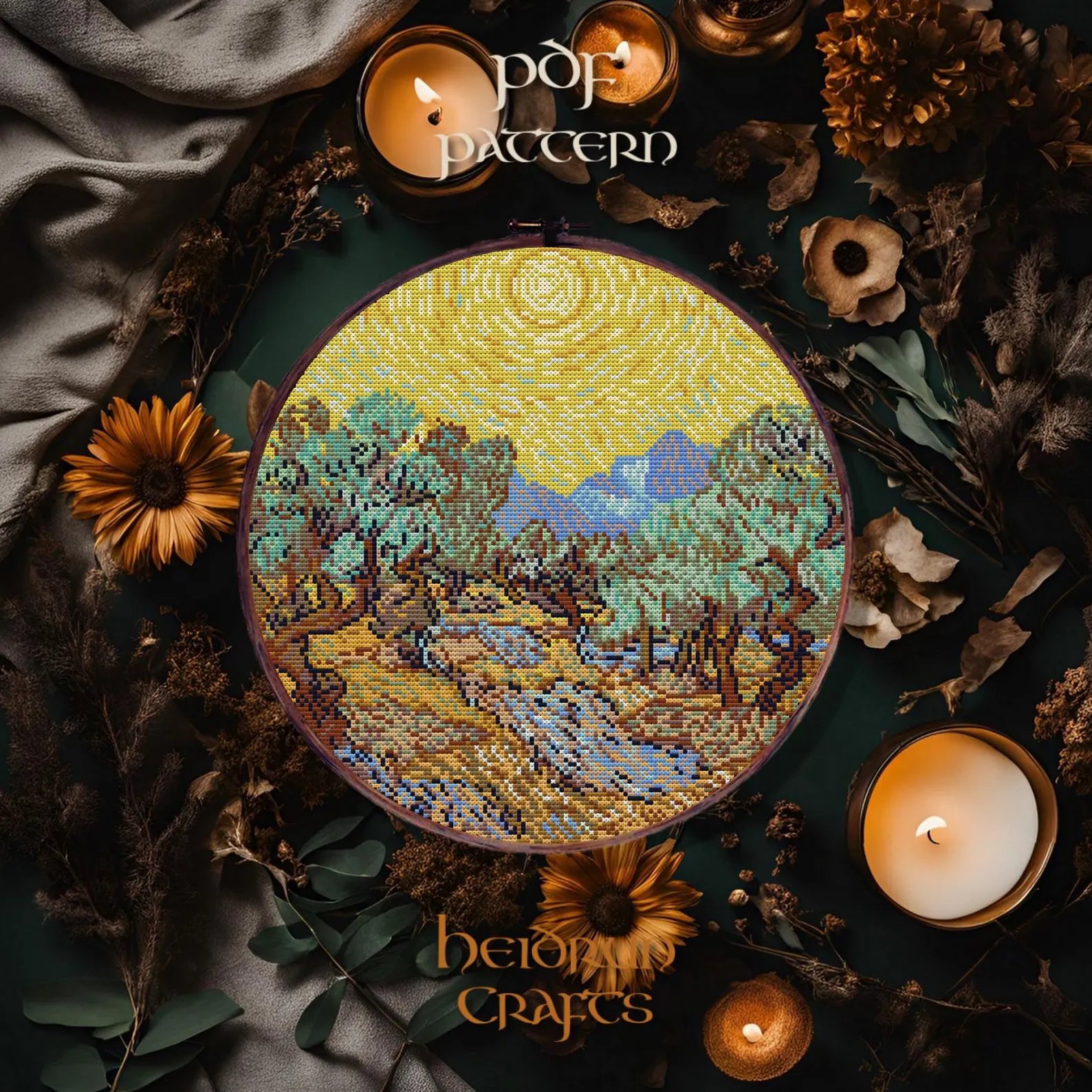 Van Gogh Olive Trees Cross Stitch Pattern PDF – Impressionist Embroidery, Art-Inspired Needlework, Digital Download