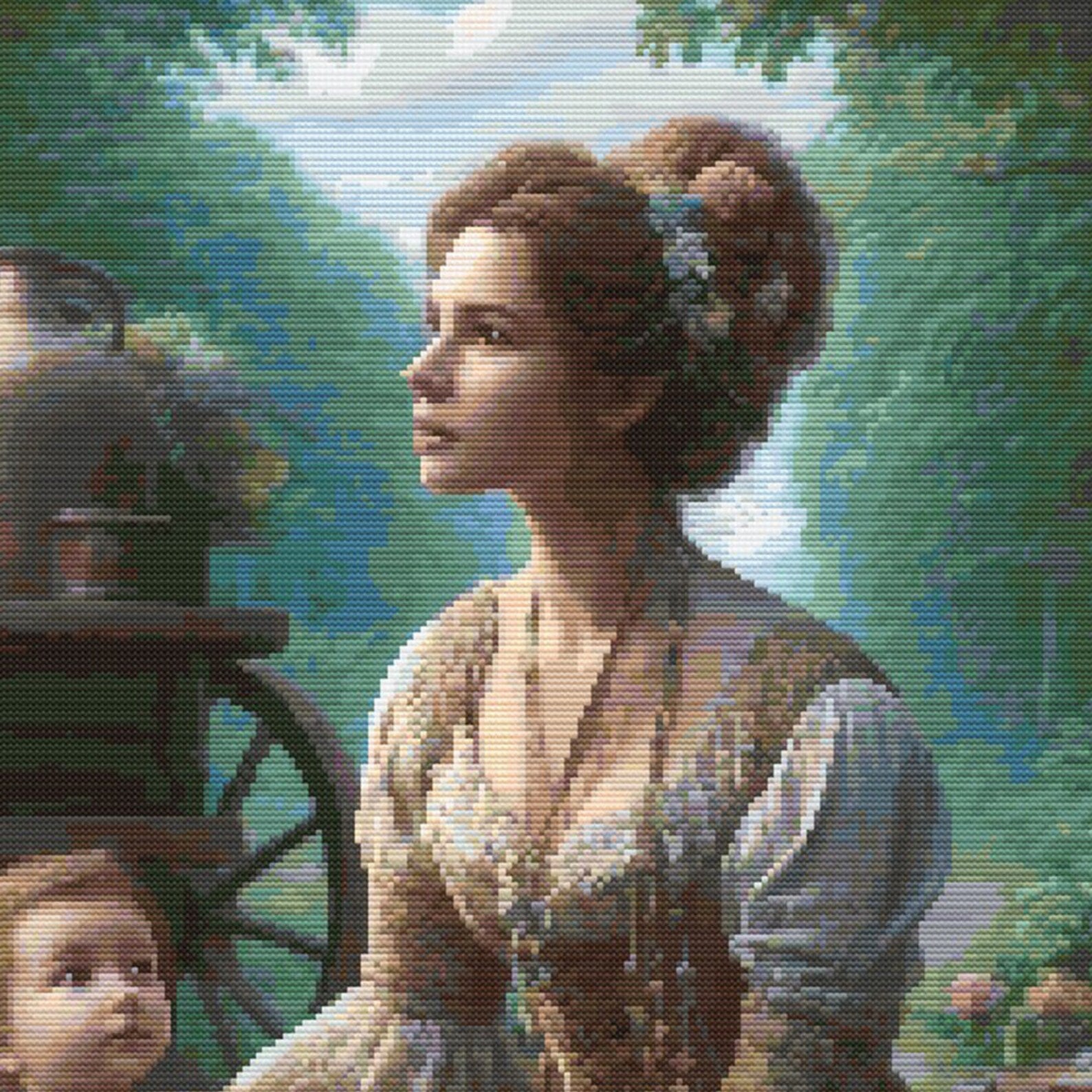 Victorian Garden Cross Stitch Pattern brings a glimpse of bygone elegance into your home. This digital download captures a detailed scene of a mother and child in vintage attire, seated beside an old cart surrounded by a lush garden. Ideal for stitchers with a passion for historical themes and intricate designs.