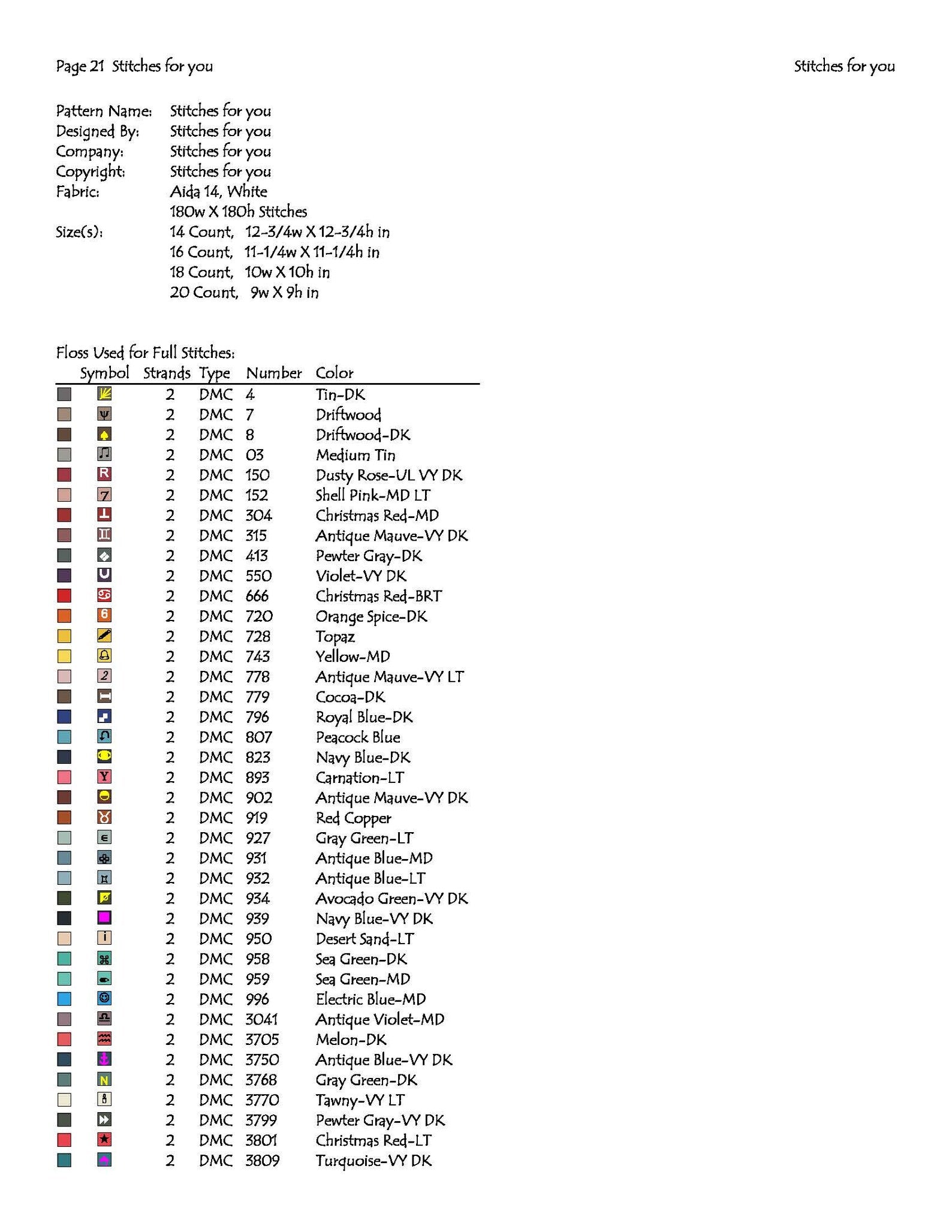 3.size chart for all counts from 14 count Aida
